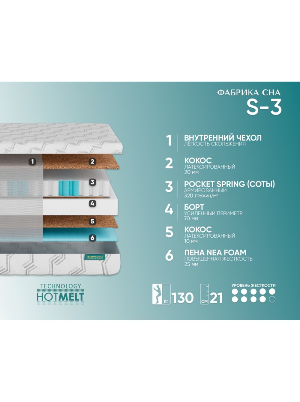 Евро периметр Система жесткого периметра матраса выполнена из пены высокой плотности. Располагается внутри матраса, создает идеальную форму его боковой части и дополнительно повышает жесткость краев, защищая их от проседания при нагрузках.